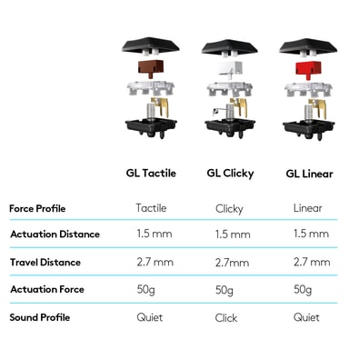 GL Clicky-bryterne er raske, reagerer kjapt, og tilbyr ytelse på samme linje som standard mekaniske tastatur men med bare halve høyden. Bryterne har en total vandringsdistanse på 2,7 mm og tilbyr en karakteristisk bumpelyd ved aktiveringsavstanden på 1,5 mm.
