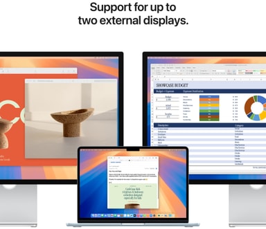 MacBook Air har to reversible Thunderbolt/USB 4-porter med en overføringshastighet på opptil 40 Gbps, som fungerer som en multifunksjonell linje mellom MacBook og eksterne enheter. Portene støtter DisplayPort-videoutgang for å kjøre en ekstern 6K-skjerm ved 60 Hz. Når du lukker lokket på den bærbare datamaskinen, kan du i tillegg nyte godt av en sekundær 5K 60 Hz skjermtilkobling.