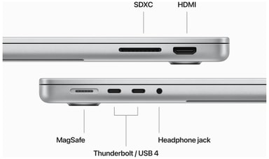 Thunderbolt,Se juridiske ansvarsfraskrivelser HDMI, SDXC, MagSafe, hodetelefonutgang, støtte for wifi 6ESe juridiske ansvarsfraskrivelser og Bluetooth 5.3