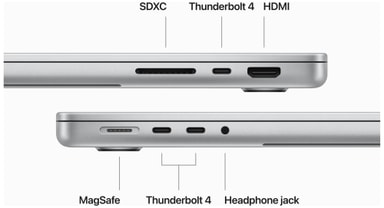 Thunderbolt,Se juridiske ansvarsfraskrivelser HDMI, SDXC, MagSafe, hodetelefonutgang, støtte for wifi 6ESe juridiske ansvarsfraskrivelser og Bluetooth 5.3