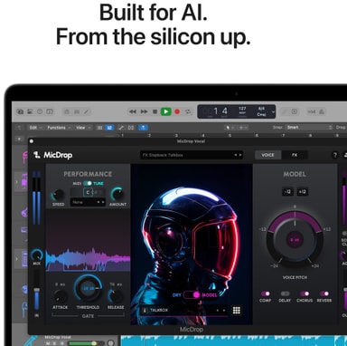 I tillegg til raskere CPU og fellesminne har M5 en kraftigere GPU med Neural Accelerators bygt inn i hver kjerne, som sørger for raskere KI-ytelse. Så du kan suse gjennom krevende arbeidsmengder i full fart.
