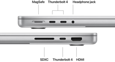 Denne MacBookPro-modellen har tre Thunderbolt4-porter, en MagSafe3-ladeport, SDXC-kortplass, HDMI-port og hodetelefonutgang. Og den støtter opptil to eksterne skjermer.
