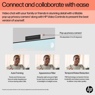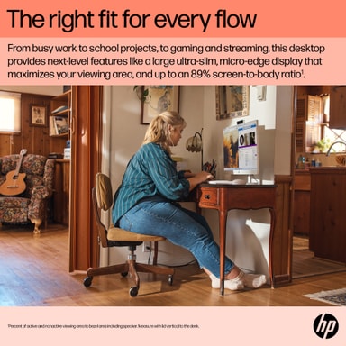 HP All-in-one drives av en AMD Ryzen™ 5 7520U-prosessor, som tilbyr en maksimal turbofrekvens på 4,3 GHz, noe som sikrer jevn og pålitelig ytelse og effektiv behandling av komplekse oppgaver.