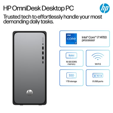 HP OmniDesk M02-0805no i7-14/16/1TB stasjonær PC drives av Intel® Core™ i7 14700 og 16 GB DDR4 RAM for å gi effektiv ytelse og rask dataoverføring til dine daglige oppgaver. Med flere porter kan du nyte sømløs tilkobling og øke produktiviteten takket være Copilot-tasten.