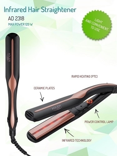 Den innovative infrarøde rettetangen AD2318 er utstyrt med keramiske plater som sikrer trygg glatting av håret. Den infrarøde teknologien gir en jevnere varmefordeling over glattejernets overflate, noe som gir håret et vakkert og sunt utseende. Apparatet har temperaturkontroll mellom 150 °C - 230 °C, noe som gjør at det kan tilpasses hårtypen optimalt. Glattejernet har en svært ergonomisk og komfortabel form og kjennetegnes av rask oppvarming. Apparatets maksimale effekt er 120 W.