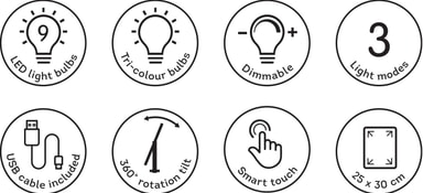 re. Hollywood 9 LED sminkespeil leveres med ni dimbare LED-pærer som gjør at du kan justere lysstyrken for perfekt belysning. Berøringskontrollen gjør det enkelt å justere innstillingene. I tillegg er det USB-drevet, noe som gjør det enkelt å bruke det hvor som helst.