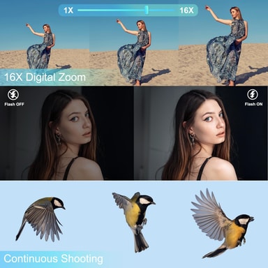 16× digital zoom og autofokus: Med opptil 16× digital zoom kan du fange fjerne motiver uten å miste klarheten. Utforsk kreativ fotografering med 20 innebygde filtereffekter – fra solnedgang og strandtoner til klassisk svart-hvitt – alt med et knappetrykk. Ekstra funksjoner som ett-trykks skjønnhetsmodus, smileregistrering, ansiktsgjenkjenning, tidsforløpsopptak og selvutløser dekker alle dine opptaksbehov.