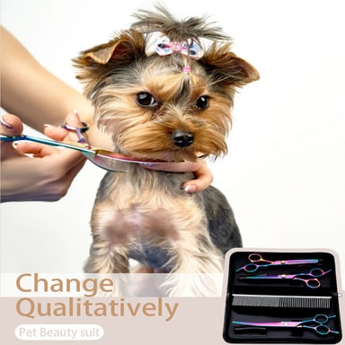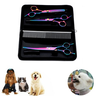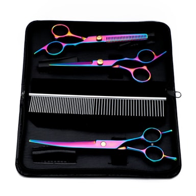Settet inneholder trimmesaks, tynningssaks, buet saks og en kam med tilhørende oppbevaringsetui.