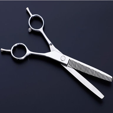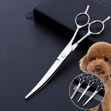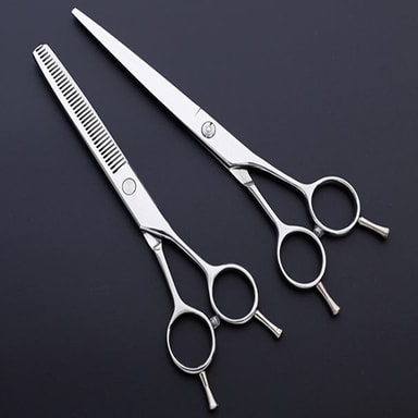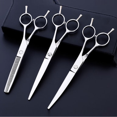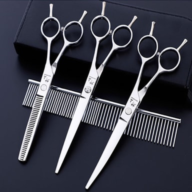 Settet inneholder trimmesaks, tynningssaks, buet saks, kam og renseklut med tilhørende oppbevaring.