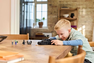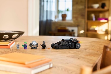 • LEGO® Batman™ Tumbler-batmobilen – lekebilen har et flammeelement festet til eksosrøret, og den kan åpnes inn til en cockpit med dashbord og plass til Batman-minifiguren