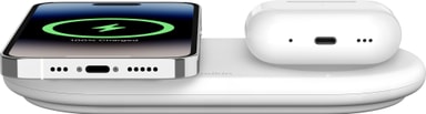 Med Belkin BoostCharge Pro 2i1 Magnetic Qi2 trådløs lader kan du enkelt lade telefonen og hodetelefonene dine. Den trådløse Qi2-laderen har 15 W og 5 W trådløse ladeplater samt en 5 W USB-C-port for kablet lading.