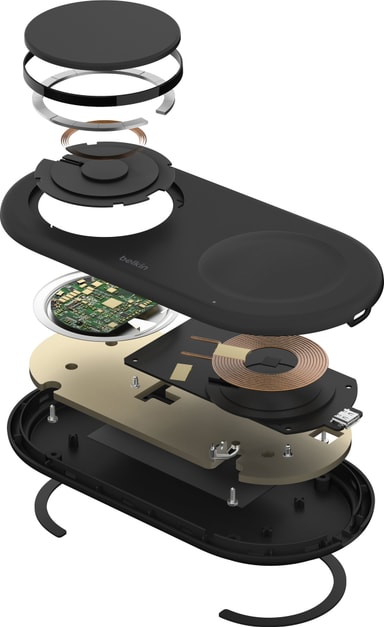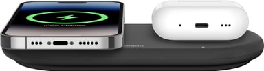 Med Belkin BoostCharge Pro 2i1 Magnetic Qi2 trådløs lader kan du enkelt lade telefonen og hodetelefonene dine. Den trådløse Qi2-laderen har 15 W og 5 W trådløse ladeplater samt en 5 W USB-C-port for kablet lading.