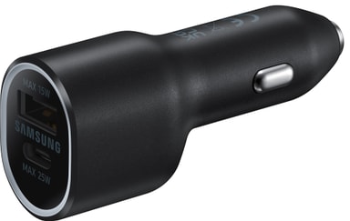 Samsung 40W billader lar deg lade to enheter på samme tid mens du kjører. Valget er ditt mellom USB-C og USB-A med henholdsvis 15W og 25W.Les mer om produktet