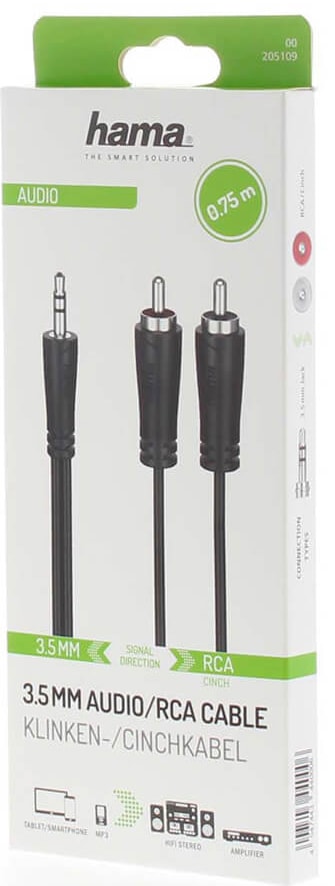 Hama lydkabel 205109 kobler MP3 til forsterkeren. Den har fargekodede plugger slik at du enkelt kan koble den til. Kabelen er 0,75 m lang.