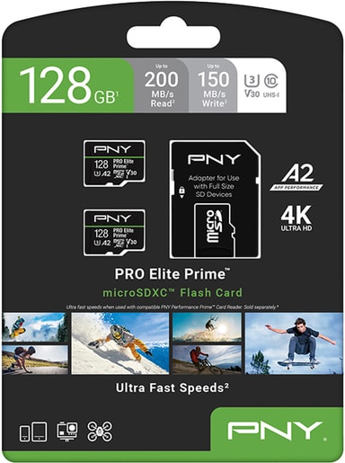 PNY PRO Elite Prime microSD kort på 128 GB tilbyr raske lese-/skrivehastigheter på opptil 200/150 MB/s. Det er perfekt for 4K-video, bilder og apper, med Class 10, U3, V30 og A2. SD-adapter er inkludert for enkel bruk med kamera og laptop.Les mer om produktet