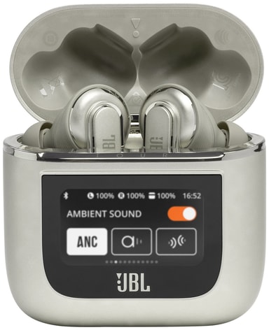 Kontroller øreproppenes innstillinger, administrer anrop og avspilling, kontroller lydinnstillingen og batterinivået og still inn alarmen – alt gjennom skjermen på ladeetuiet uten å bruke telefonen eller JBL Headphones-appen.