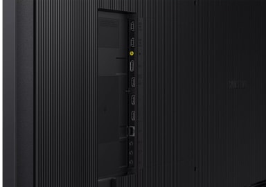 Den slanke, flate baksiden og den symmetriske rammedesignen lar deg bruke skjermen i liggende eller stående orientering uten irriterende mellomrom mellom rammen og veggen. Strømkontakten er plassert på siden for å redusere dybden ytterligere, og tilkoblingskablene kan enkelt føres gjennom kabelføringene på baksiden.