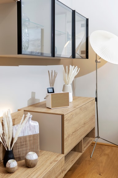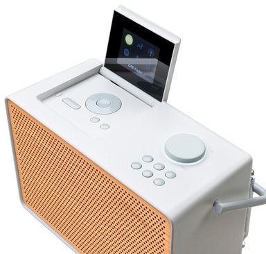 Åpne displayet for å få tilgang til avanserte innstillinger som EQ og Bluetooth-tilkobling. Og lukk det igjen for å beholde radioens karakteristiske minimalistiske utseende.