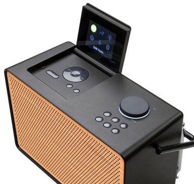 Åpne displayet for å få tilgang til avanserte innstillinger som EQ og Bluetooth-tilkobling. Og lukk det igjen for å beholde radioens karakteristiske minimalistiske utseende.