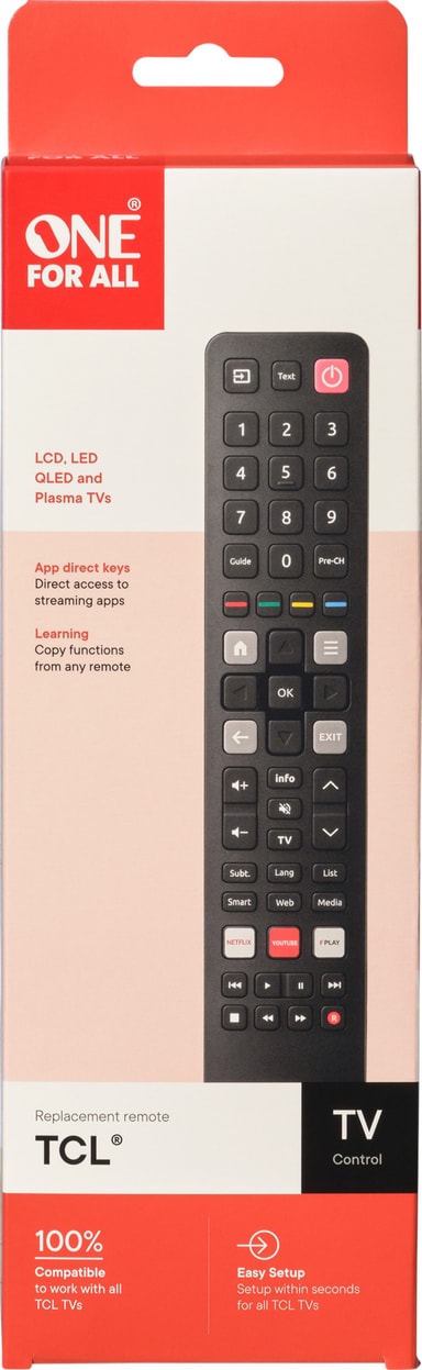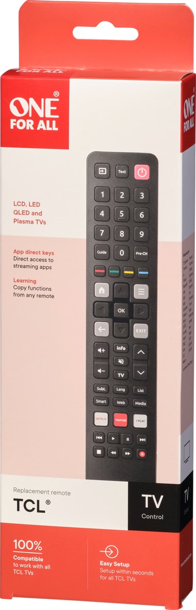 Med OFA URC 4922 ekstra fjernkontroll kan du enkelt styre TCL-TV-en din. Denne infrarøde fjernkontrollen fungerer sømløst med alle typer TCL- og Thomson-TV-er, og har læringsfunksjon, tre snarveistaster for apper og er enkel å konfigurere.Les mer om produktet