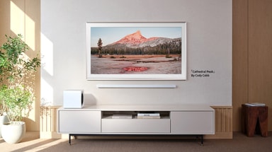 Samsung The Frame 32" ramme forvandler TV-en din til et lite kunstverk som er tilpasset din unike stil og ditt hjem på en enkel måte. Den tilpassbare rammen lar deg raskt forandre utseende på TV-en, slik at det får et oppfriskende uttrykk som passer godt inn i stuen.