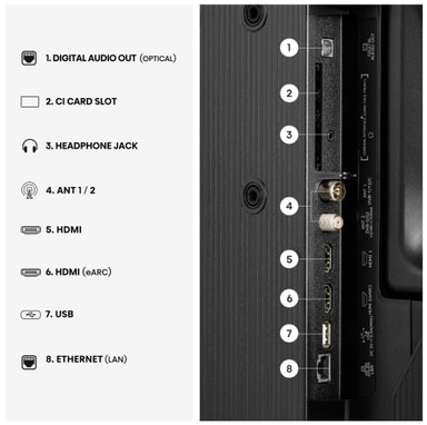 Denne TV-en inkluderer 2 HDMI-porter, 2 USB-porter, Wi-fi 4 og Bluetooth-tilkoblinger for sømløs integrasjon med enhetene dine.