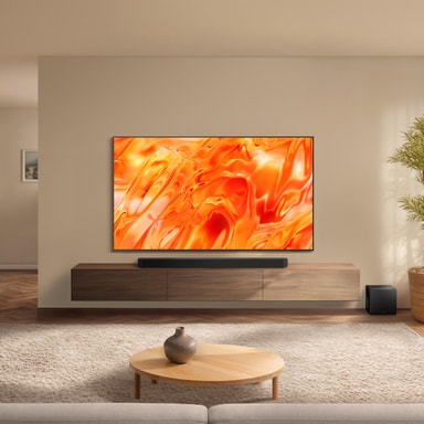 Hvis du henger TV-en på veggen og bruker en dekorativ kabelskjuler får du et veldig pent, ryddig og plassbesparende TV-oppsett. Pass på at veggfestet tåler vekten av TV-en du velger og VESA målene matcher tv/veggfeste. Hvis du scroller lenger ned på siden kan du se forslag til veggfeste til denne TV-en