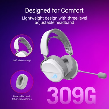 Hev spillopplevelsen din med ASUS ROG Pelta Wireless gamingheadset. Med 50 mm titanelementer og 10 mm wideband-mikrofon gir det deg oppslukende, flott lyd. Med Bluetooth- og USB-C-tilkobling gir det sømløs trådløs ytelse.Les mer om produktet