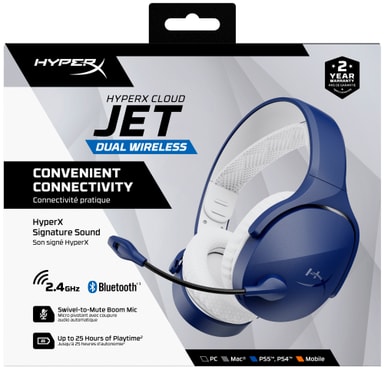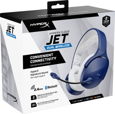 HyperX Cloud Jet trådløst gamingheadset tilbyr allsidige tilkoblingsmuligheter og oppslukende lyd for spillere på flere plattformer. Det er designet for komfort under lange spilløkter, og har en lett konstruksjon og øreputer i pustende netting. Med to trådløse alternativer kan det sømløst kobles til PC-er, konsoller og mobile enheter, noe som sikrer en uavbrutt spillopplevelse.