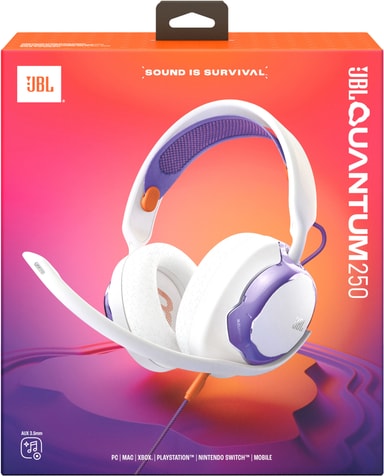 JBL Quantum 250 gaming headset leverer oppslukende lyd med 50 mm dynamiske drivere i karbon, JBL Quantum Spatial Sound og en kardioid støyreduserende mikrofon, noe som sikrer klar kommunikasjon og komfort på alle plattformer.Les mer om produktet