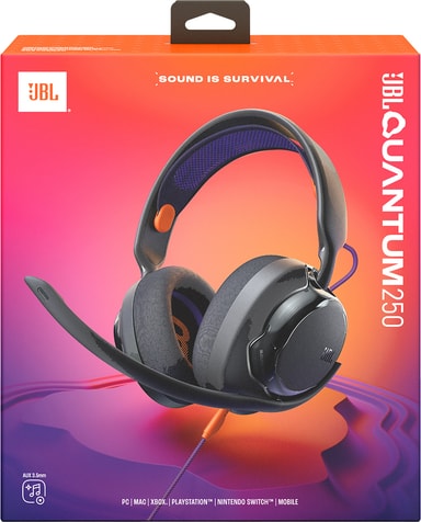 JBL Quantum 250 gaming headset leverer oppslukende lyd med 50 mm dynamiske drivere i karbon, JBL Quantum Spatial Sound og en kardioid støyreduserende mikrofon, noe som sikrer klar kommunikasjon og komfort på alle plattformer.Les mer om produktet