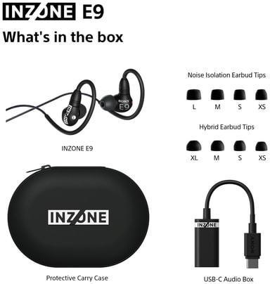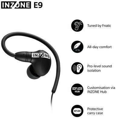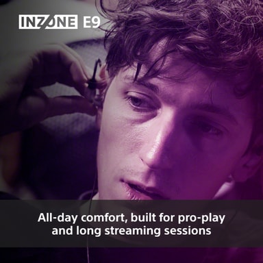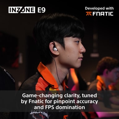 Sony Inzone E9 in-ear gamingheadset er FPS-optimaliserte øreplugger utviklet i samarbeid med Fnatic, med støyisolerende tupper, USB-C lydboks med 360 Spatial Sound, EQ via INZONE Hub, og både 3,5 mm og USB-C-tilkobling. De er lette med doble ørepropper og gir klarhet, komfort og konkurransefokusert lyd.