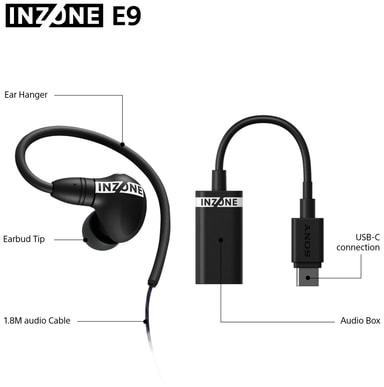 Når de kobles til via den medfølgende USB-C-lydboksen og brukes med INZONE Hub PC-programvaren, kan E9 gi 7.1-kanals virtuell surround og Sonys 360 Spatial Sound for gaming, som hjelper med nøyaktig retningsbestemt lyd.