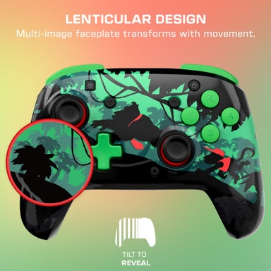 Donkey Kong Lenticular-utgaven har en høyglansplate som skifter mellom to livlige jungelscener når du vipper kontrolleren. Dette 3D-effekt-kunstverket bringer Donkey Kongs verden til live, komplettert med markante røde aksenter på thumbsticks for et iøynefallende, offisielt lisensiert utseende.