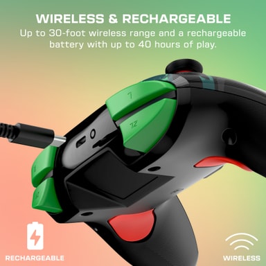 Rematch Wireless har responsive knapper, en pålitelig D-pad og to programmerbare bakknapper for egendefinerte snarveier. Den inkluderer en dedikert funksjonsknapp for omprogrammering underveis og en synkroniseringsknapp på toppen.