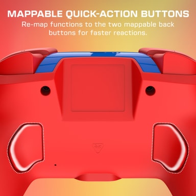 Rematch Wireless har responsive ansiktsknapper, en pålitelig D-pad og to programmerbare bakknapper for egendefinerte snarveier. Den inkluderer en dedikert funksjonsknapp for rask omprogrammering og en synkroniseringsknapp på toppen.