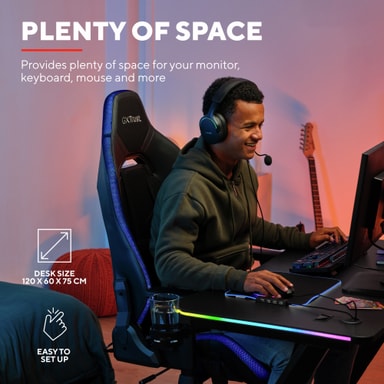 Ta gamingrommet ditt til neste nivå med Trust GXT709 LUMINUS RGB gamingbord. Det 120x60 cm store skrivebordet gir deg nok plass til alt favorittutstyret ditt. Den integrerte RGB-belysningen gir oppsettet ditt litt ekstra stil. Takket være det innebygde kabelhåndteringssystemet kan du skjule kabler og holde skrivebordet pent og ryddig. Med koppholderen kan du ha drikke i nærheten på et trygt sted, og hodetelefonkroken gir deg et sted å henge opp headsettet når du er ferdig med å spille.