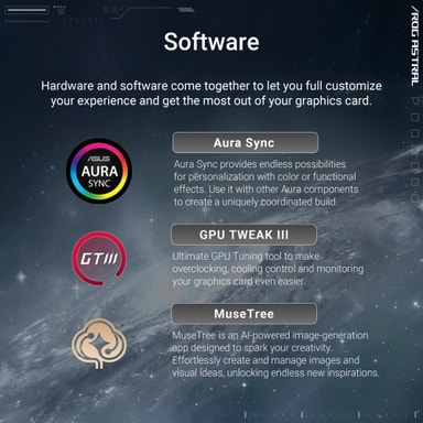 ROG Astral bruker GPU Tweak III for presisjonstuning, Power Detector+ for å overvåke kabelhelse og MuseTree for KI-bildegenerering.
