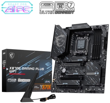 MSI X870E GAMING PLUS WIFI hovedkort gir en solid plattform som støtter de nyeste AMD Ryzen™ 9000, 8000 og 7000-prosessorene. Med avanserte funksjoner og høyteknologiske løsninger sikrer MSI X870E GAMING PLUS WIFI maksimal ytelse og lynrask tilkobling.