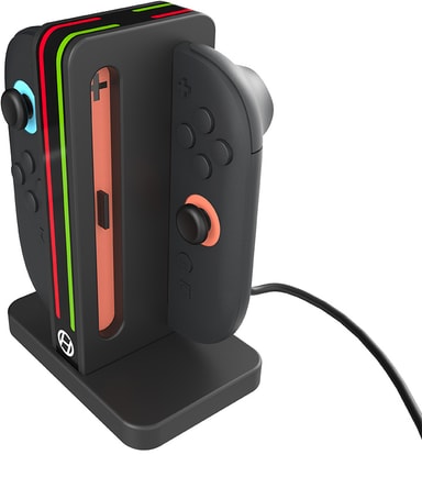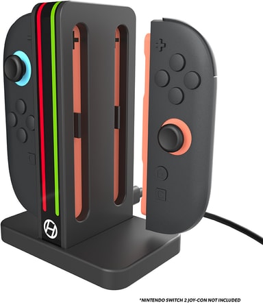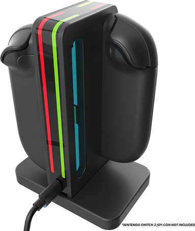 Hyperkin Power Spire Switch 2 ladestasjon gjør det mulig å lade opptil 4 Joy-Con-kontrollere samtidig, har magnetisk snap-in-dokking, USB-C til C hurtigladetilkobling og LED-indikatorer som tydelig viser ladestatus.
