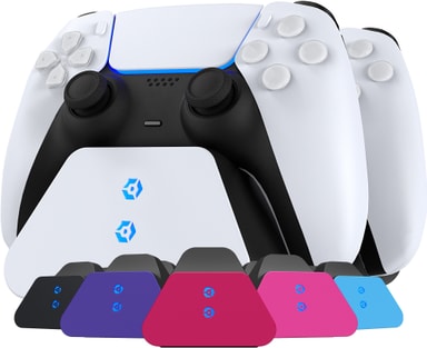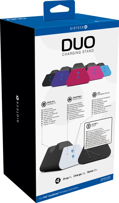 Takket være Gioteck Duo PlayStation 5 ladestasjon for kontroller er du alltid klar for action. Ladestasjonen holder kontrollerne dine ladet til enhver tid. I tillegg har basestasjonen en ekstra USB-C-port for lading av flere kontrollere eller andre enheter. Den praktiske laderen kan lade to kontrollere samtidig og har et kompakt, elegant design med LED-indikatorer for ladestatus. Leveres med seks utskiftbare frontplater, slik at du kan tilpasse utseendet til dine kontrollere.