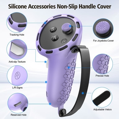 Silikontilbehørssett for Meta Quest 3S med VR-headsetdeksel / kontrollgrep / ansiktsmaske - Lilla【Fullstendig beskyttelse】 Silikonsett med syv deler gir omfattende beskyttelse for VR-headsettet og kontrollerene dine.【Perfekt passform】 Spesialstøpt deLes mer om produktet