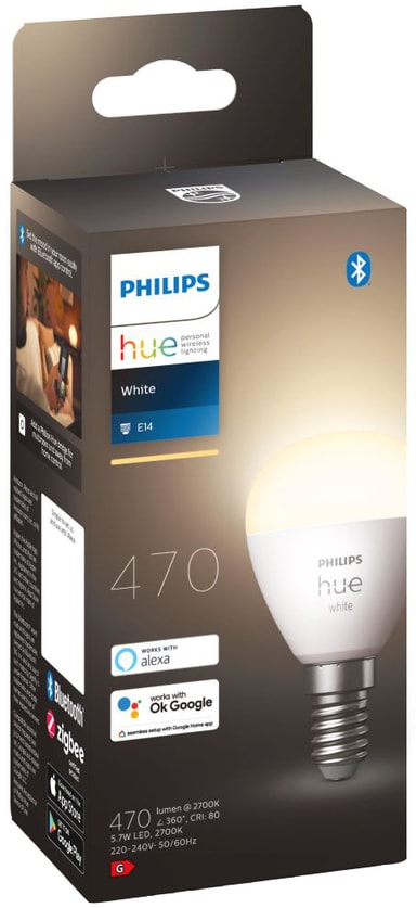 Philips Hue White 5,7W Luster E14 er en smart løsning for mindre lamper og armaturer i hjemmet ditt. Skap den rette stemningen med et mykt hvit lys og styr lysene enkelt via Hue Bluetooth-app. Eventuelt kan du kjøpe Hue Bridge og dra nytte av flere funksjoner.