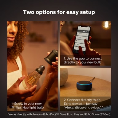 Opplys hjemmet ditt med en myk behagelig glød med Philips Hue White lyspære 7,2W Filament ST72 E27. Den energieffektive LED-pæren med en myk behagelig glød har dimmefunksjoner samt et vintage design som vil gi et stilig preg til hjemmet ditt. Du kan nyte umiddelbar kontroll vil Bluetooth og Philips Hue-appen.