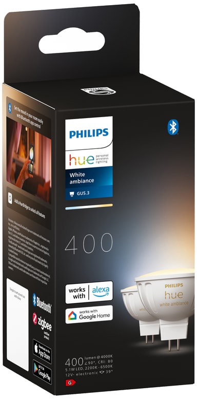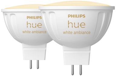 Philips Hue White Ambiance MR16 LED-lyspære 5,1 W 2-pk fyller hjemmet ditt med ulike nyanser av hvitt. Den smarte lyspæren er dimbar og kan enkelt styres via Philips Hue Bluetooth-appen, stemmen eller Hue Bridge.Les mer om produktet
