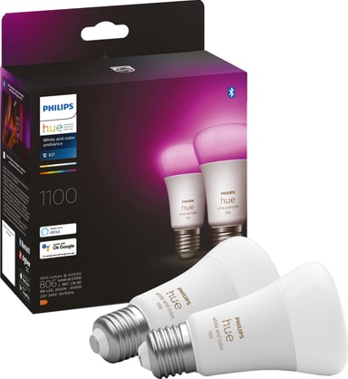 Philips Hue White and Color Ambiance 9W A60 E27 vil hjelpe deg med å lage en hyggelig atmosfære i ditt hjem, slik at dine daglige gjøremål kan gjøres i perfekte lysforhold. Pærene er dimbare og kan styres via Phillips Hue-appen på smarttelefon, PC eller nettbrett. Pakken inkluderer to Philips Hue LED-lyspærer.