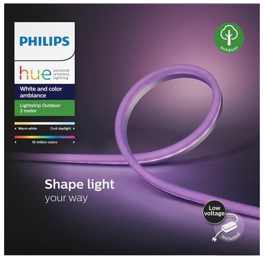Med Philips Hue lysstripe Outdoor 8718699709853 kan du lyse opp boligen din utvendig på utallige måter. Den er dimbar, gjengir RGB-farger, kan styres med appen Philips Hue og kobles til Philips Hue Bridge for ytterligere tilpasningsmuligheter.Les mer om produktet