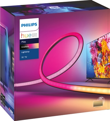 Philips Hue Play Gradient lysstripe TV 75" vil forbedre hjemmekinoopplevelsen ved å synkronisere innholdet på TV-en med fargerikt lys. Hue Bride og Hue Sync Box kreves for å få full kontroll over lysstripsen.Les mer om produktet