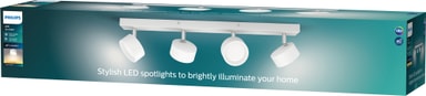 Philips Bracia spotlys fra Philips er designet for å lyse opp hjemmet ditt med varmhvitt lys. Den har et moderne utseende i hvitt og er laget av metall. Fire justerbare hoder og bred spredningsvinkel sikrer god lysdekning i ethvert rom, enten det er stue eller gang. Denne spotlighten er også ideell for belysning av kjøkkenbenker eller andre områder hvor du trenger rikelig med sterkt lys.