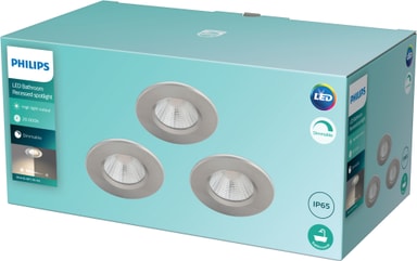Philips Dive Ceiling spotlys 5,5 W 3-pakning er en stilig løsning for lys både innendørs og utendørs. Det innfelte spotlyset har justerbar dimming, IP65-beskyttelse mot vann og støv, varmt 2700K lys og EyeComfort-teknologi.Les mer om produktet
